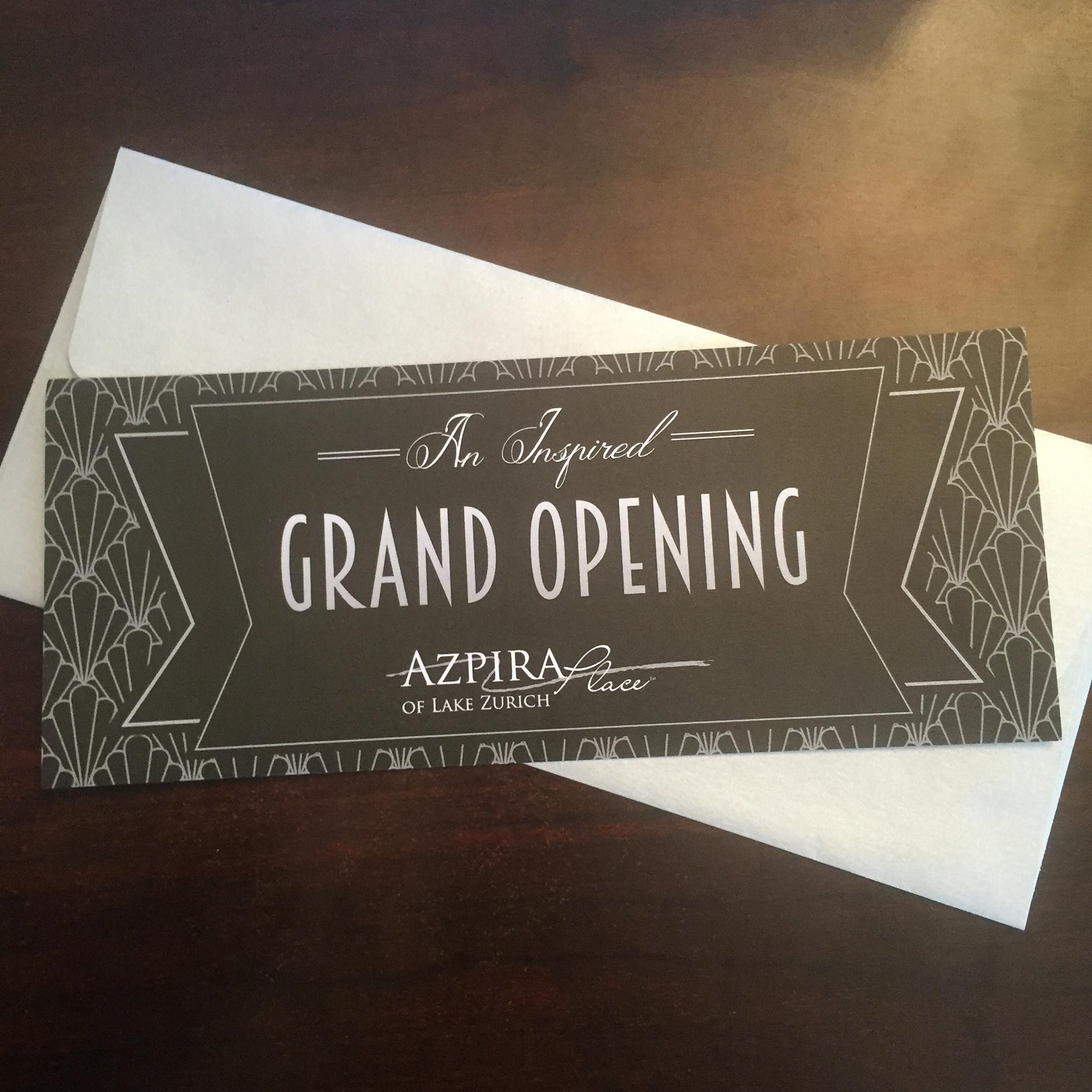 Azpira Place wanted an invitation that was classy, themed and more importantly, not in their brand style so it would stand out from their other direct mail. Printed black and white on a silver-tone, metallic card stock and a coordinating silver metallic envelope sets this piece apart.